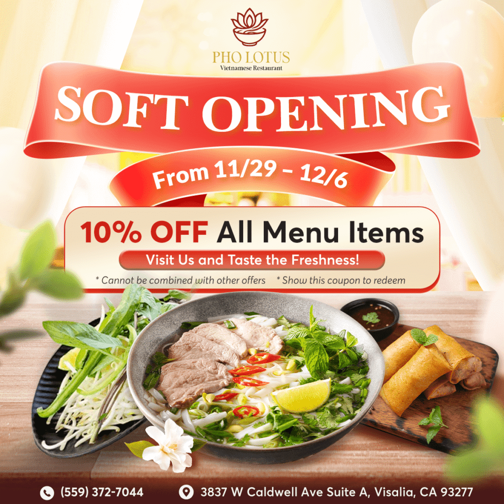 Nestled in the heart of Visalia, California, we bring the essence of Vietnamese comfort food to your table with care and authenticity. From the first simmer of our broth to the last sprinkle of herbs, everything is crafted with passion. Pho Lotus isn’t just a restaurant—it’s a gathering place where families, friends, and food lovers come together to share warmth, laughter, and great food.